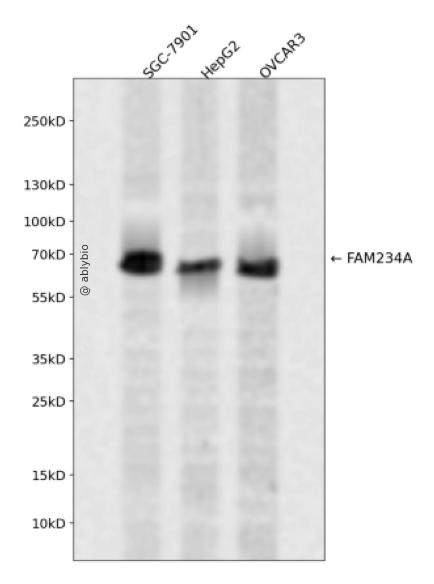Western blot analysis of FAM234A expressed in SGC-7901,HepG2,OVCAR3 using FAM234A Rabbit pAb at 1:1000. Secondary antibody: HRP Goat Anti-Rabbit IgG (H+L) at 1:5000. Lysates/proteins: 30ug per lane. Blocking buffer: 5% non-fat dry milk in TBST. Detection: ECL Enhanced Kit. Exposure time: 120s.