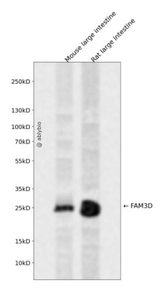 Western blot analysis of FAM3D expressed in Mouse large intestine,Rat large intestine using FAM3D Rabbit pAb at 1:1000. Secondary antibody: HRP Goat Anti-Rabbit IgG (H+L) at 1:5000. Lysates/proteins: 30ug per lane. Blocking buffer: 5% non-fat dry milk in TBST. Detection: ECL Enhanced Kit. Exposure time: 120s.