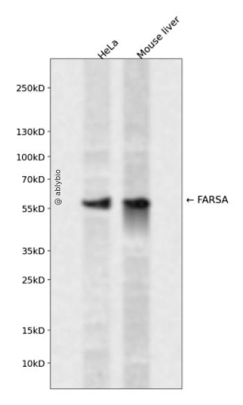 Western blot analysis of FARSA expressed in HeLa,Mouse liver using FARSA Rabbit pAb at 1:1000. Secondary antibody: HRP Goat Anti-Rabbit IgG (H+L) at 1:5000. Lysates/proteins: 30ug per lane. Blocking buffer: 5% non-fat dry milk in TBST. Detection: ECL Enhanced Kit. Exposure time: 120s.