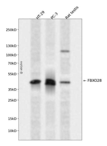 Western blot analysis of FBXO28 expressed in HT-29,PC-3,Rat testis using FBXO28 Rabbit pAb at 1:1000. Secondary antibody: HRP Goat Anti-Rabbit IgG (H+L) at 1:5000. Lysates/proteins: 30ug per lane. Blocking buffer: 5% non-fat dry milk in TBST. Detection: ECL Enhanced Kit. Exposure time: 120s.