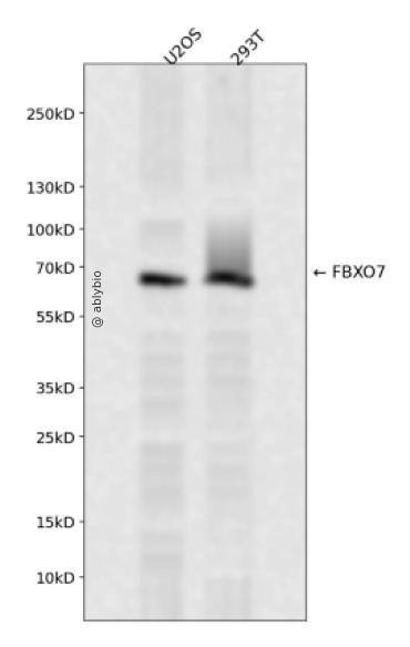 Western blot analysis of FBXO7 expressed in U2OS,293T using FBXO7 Rabbit pAb at 1:1000. Secondary antibody: HRP Goat Anti-Rabbit IgG (H+L) at 1:5000. Lysates/proteins: 30ug per lane. Blocking buffer: 5% non-fat dry milk in TBST. Detection: ECL Enhanced Kit. Exposure time: 120s.