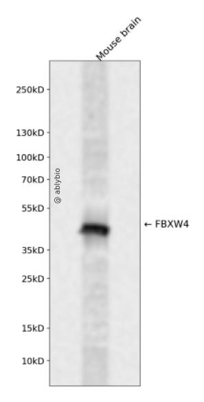Western blot analysis of FBXW4 expressed in Mouse brain using FBXW4 Rabbit pAb at 1:1000. Secondary antibody: HRP Goat Anti-Rabbit IgG (H+L) at 1:5000. Lysates/proteins: 30ug per lane. Blocking buffer: 5% non-fat dry milk in TBST. Detection: ECL Enhanced Kit. Exposure time: 120s.