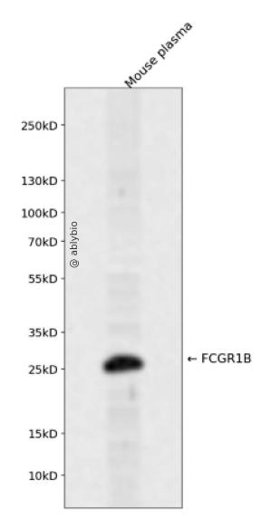 Western blot analysis of FCGR1B expressed in Mouse plasma using FCGR1B Rabbit pAb at 1:1000. Secondary antibody: HRP Goat Anti-Rabbit IgG (H+L) at 1:5000. Lysates/proteins: 30ug per lane. Blocking buffer: 5% non-fat dry milk in TBST. Detection: ECL Enhanced Kit. Exposure time: 120s.