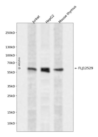 Western blot analysis of FLJ12529 expressed in Jurkat,HepG2,Mouse thymus using FLJ12529 Rabbit pAb at 1:1000. Secondary antibody: HRP Goat Anti-Rabbit IgG (H+L) at 1:5000. Lysates/proteins: 30ug per lane. Blocking buffer: 5% non-fat dry milk in TBST. Detection: ECL Enhanced Kit. Exposure time: 120s.