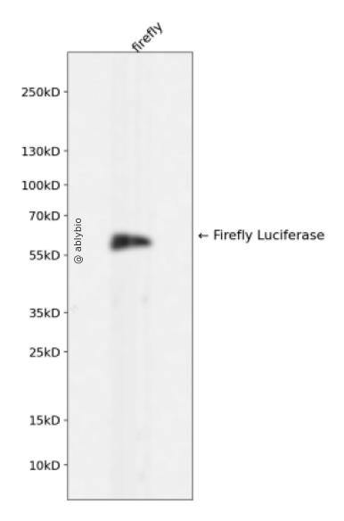 Western blot analysis of Firefly Luciferase expressed in firefly using Firefly Luciferase Rabbit mAb at 1:1000. Secondary antibody: HRP Goat Anti-Rabbit IgG (H+L) at 1:5000. Lysates/proteins: 30ug per lane. Blocking buffer: 5% non-fat dry milk in TBST. Detection: ECL Enhanced Kit. Exposure time: 120s.