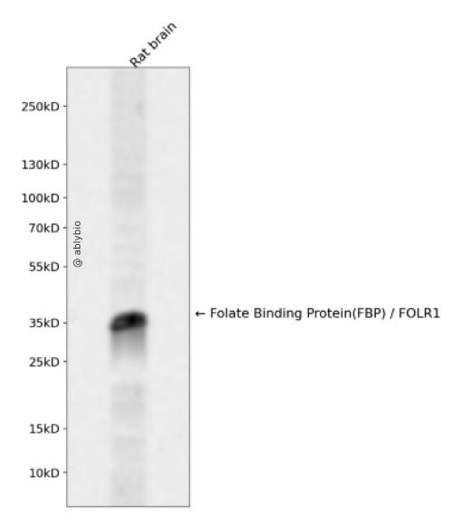 Western blot analysis of Folate Binding Protein(FBP) / FOLR1 expressed in Rat brain using Folate Binding Protein(FBP) / FOLR1 Rabbit pAb at 1:1000. Secondary antibody: HRP Goat Anti-Rabbit IgG (H+L) at 1:5000. Lysates/proteins: 30ug per lane. Blocking buffer: 5% non-fat dry milk in TBST. Detection: ECL Enhanced Kit. Exposure time: 120s.