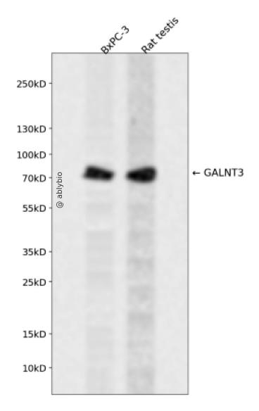 Western blot analysis of GALNT3 expressed in BxPC-3,Rat testis using GALNT3 Rabbit pAb at 1:1000. Secondary antibody: HRP Goat Anti-Rabbit IgG (H+L) at 1:5000. Lysates/proteins: 30ug per lane. Blocking buffer: 5% non-fat dry milk in TBST. Detection: ECL Enhanced Kit. Exposure time: 120s.