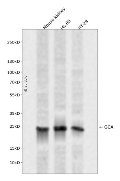 Western blot analysis of GCA expressed in Mouse kidney,HL-60,HT-29 using GCA Rabbit pAb at 1:1000. Secondary antibody: HRP Goat Anti-Rabbit IgG (H+L) at 1:5000. Lysates/proteins: 30ug per lane. Blocking buffer: 5% non-fat dry milk in TBST. Detection: ECL Enhanced Kit. Exposure time: 120s.