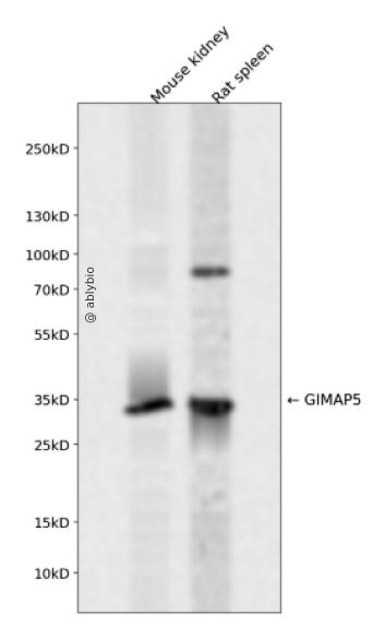 Western blot analysis of GIMAP5 expressed in Mouse kidney,Rat spleen using GIMAP5 Rabbit pAb at 1:1000. Secondary antibody: HRP Goat Anti-Rabbit IgG (H+L) at 1:5000. Lysates/proteins: 30ug per lane. Blocking buffer: 5% non-fat dry milk in TBST. Detection: ECL Enhanced Kit. Exposure time: 120s.