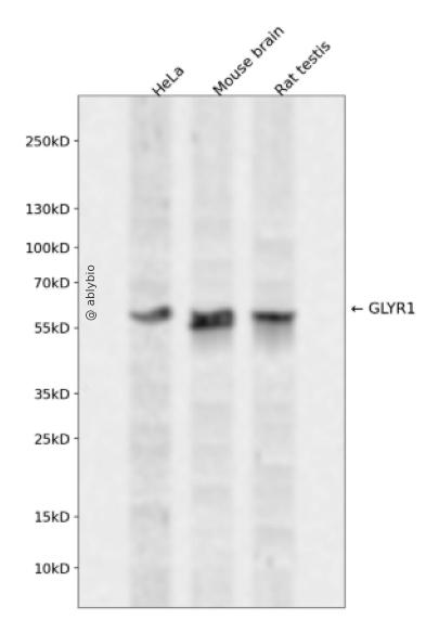 Western blot analysis of GLYR1 expressed in HeLa,Mouse brain,Rat testis using GLYR1 Rabbit pAb at 1:1000. Secondary antibody: HRP Goat Anti-Rabbit IgG (H+L) at 1:5000. Lysates/proteins: 30ug per lane. Blocking buffer: 5% non-fat dry milk in TBST. Detection: ECL Enhanced Kit. Exposure time: 120s.