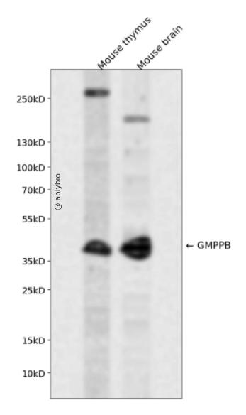 Western blot analysis of GMPPB expressed in Mouse thymus,Mouse brain using GMPPB Rabbit pAb at 1:1000. Secondary antibody: HRP Goat Anti-Rabbit IgG (H+L) at 1:5000. Lysates/proteins: 30ug per lane. Blocking buffer: 5% non-fat dry milk in TBST. Detection: ECL Enhanced Kit. Exposure time: 120s.