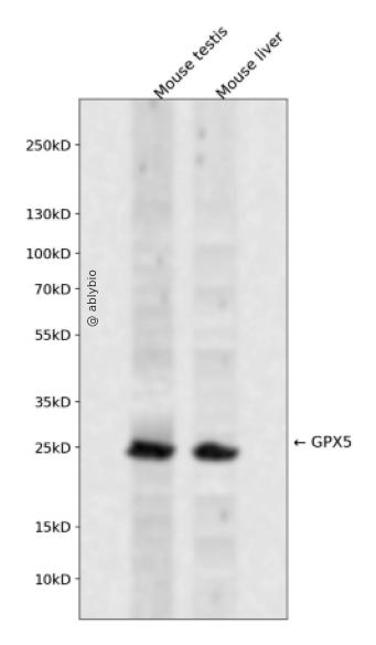 Western blot analysis of GPX5 expressed in Mouse testis,Mouse liver using GPX5 Rabbit pAb at 1:1000. Secondary antibody: HRP Goat Anti-Rabbit IgG (H+L) at 1:5000. Lysates/proteins: 30ug per lane. Blocking buffer: 5% non-fat dry milk in TBST. Detection: ECL Enhanced Kit. Exposure time: 120s.
