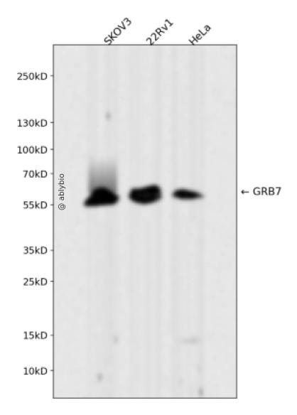 Western blot analysis of GRB7 expressed in SKOV3,22Rv1,HeLa using GRB7 Rabbit mAb at 1:1000. Secondary antibody: HRP Goat Anti-Rabbit IgG (H+L) at 1:5000. Lysates/proteins: 30ug per lane. Blocking buffer: 5% non-fat dry milk in TBST. Detection: ECL Enhanced Kit. Exposure time: 120s.