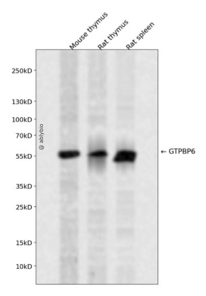 Western blot analysis of GTPBP6 expressed in Mouse thymus,Rat thymus,Rat spleen using GTPBP6 Rabbit pAb at 1:1000. Secondary antibody: HRP Goat Anti-Rabbit IgG (H+L) at 1:5000. Lysates/proteins: 30ug per lane. Blocking buffer: 5% non-fat dry milk in TBST. Detection: ECL Enhanced Kit. Exposure time: 120s.