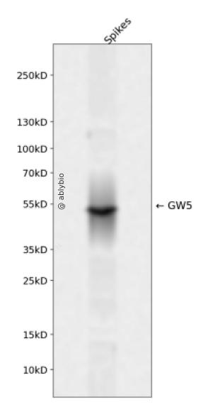 Western blot analysis of GW5 expressed in Spikes using GW5 Rabbit pAb at 1:1000. Secondary antibody: HRP Goat Anti-Rabbit IgG (H+L) at 1:5000. Lysates/proteins: 30ug per lane. Blocking buffer: 5% non-fat dry milk in TBST. Detection: ECL Enhanced Kit. Exposure time: 120s.