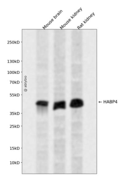 Western blot analysis of HABP4 expressed in Mouse brain,Mouse kidney,Rat kidney using HABP4 Rabbit pAb at 1:1000. Secondary antibody: HRP Goat Anti-Rabbit IgG (H+L) at 1:5000. Lysates/proteins: 30ug per lane. Blocking buffer: 5% non-fat dry milk in TBST. Detection: ECL Enhanced Kit. Exposure time: 120s.