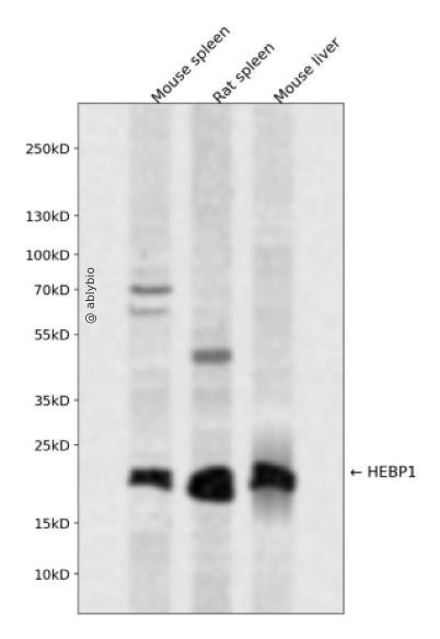 Western blot analysis of HEBP1 expressed in Mouse spleen,Rat spleen,Mouse liver using HEBP1 Rabbit pAb at 1:1000. Secondary antibody: HRP Goat Anti-Rabbit IgG (H+L) at 1:5000. Lysates/proteins: 30ug per lane. Blocking buffer: 5% non-fat dry milk in TBST. Detection: ECL Enhanced Kit. Exposure time: 120s.