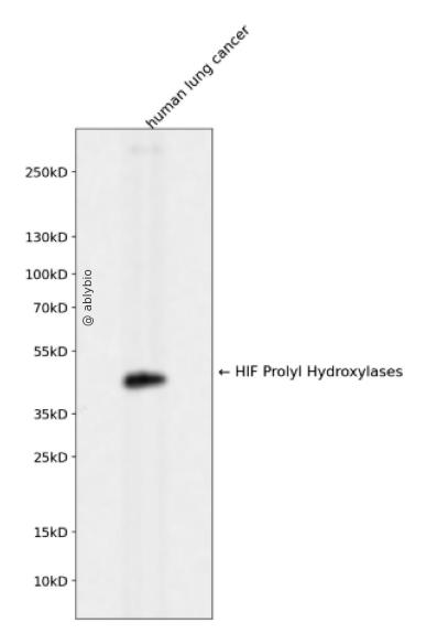Western blot analysis of HIF Prolyl Hydroxylases expressed in human lung cancer using HIF Prolyl Hydroxylases Rabbit mAb at 1:1000. Secondary antibody: HRP Goat Anti-Rabbit IgG (H+L) at 1:5000. Lysates/proteins: 30ug per lane. Blocking buffer: 5% non-fat dry milk in TBST. Detection: ECL Enhanced Kit. Exposure time: 120s.