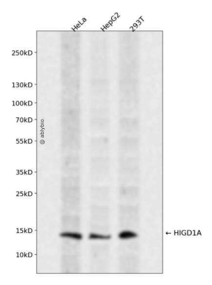 Western blot analysis of HIGD1A expressed in HeLa,HepG2,293T using HIGD1A Rabbit pAb at 1:1000. Secondary antibody: HRP Goat Anti-Rabbit IgG (H+L) at 1:5000. Lysates/proteins: 30ug per lane. Blocking buffer: 5% non-fat dry milk in TBST. Detection: ECL Enhanced Kit. Exposure time: 120s.