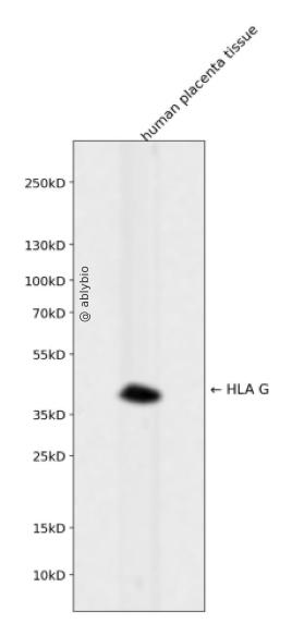 Western blot analysis of HLA G expressed in human placenta tissue using HLA G Rabbit mAb at 1:1000. Secondary antibody: HRP Goat Anti-Rabbit IgG (H+L) at 1:5000. Lysates/proteins: 30ug per lane. Blocking buffer: 5% non-fat dry milk in TBST. Detection: ECL Enhanced Kit. Exposure time: 120s.