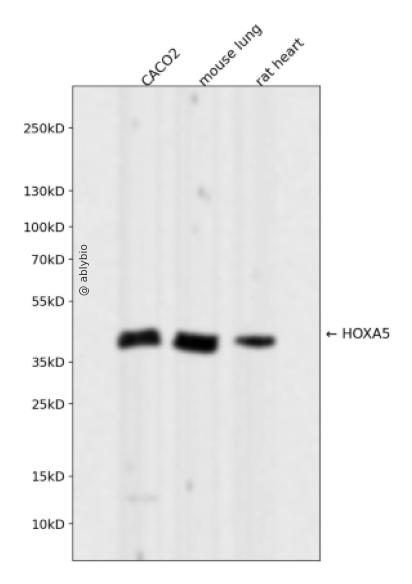 Western blot analysis of HOXA5 expressed in CACO2,mouse lung,rat heart using HOXA5 Rabbit mAb at 1:1000. Secondary antibody: HRP Goat Anti-Rabbit IgG (H+L) at 1:5000. Lysates/proteins: 30ug per lane. Blocking buffer: 5% non-fat dry milk in TBST. Detection: ECL Enhanced Kit. Exposure time: 120s.