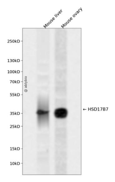 Western blot analysis of HSD17B7 expressed in Mouse liver,Mouse ovary using HSD17B7 Rabbit pAb at 1:1000. Secondary antibody: HRP Goat Anti-Rabbit IgG (H+L) at 1:5000. Lysates/proteins: 30ug per lane. Blocking buffer: 5% non-fat dry milk in TBST. Detection: ECL Enhanced Kit. Exposure time: 120s.
