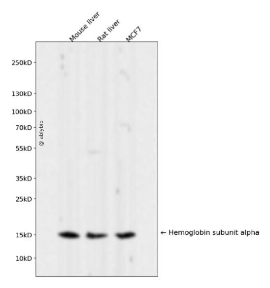 Western blot analysis of Hemoglobin subunit alpha expressed in Mouse liver,Rat liver,MCF7 using Hemoglobin subunit alpha Rabbit mAb at 1:1000. Secondary antibody: HRP Goat Anti-Rabbit IgG (H+L) at 1:5000. Lysates/proteins: 30ug per lane. Blocking buffer: 5% non-fat dry milk in TBST. Detection: ECL Enhanced Kit. Exposure time: 120s.