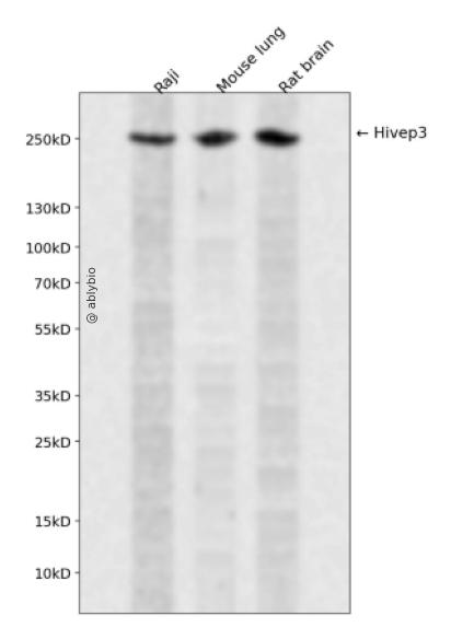 Western blot analysis of Hivep3 expressed in Raji,Mouse lung,Rat brain using Hivep3 Rabbit pAb at 1:1000. Secondary antibody: HRP Goat Anti-Rabbit IgG (H+L) at 1:5000. Lysates/proteins: 30ug per lane. Blocking buffer: 5% non-fat dry milk in TBST. Detection: ECL Enhanced Kit. Exposure time: 120s.