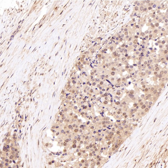 Immunohistochemical analysis of paraffin-embedded Human testis cancer, using the Antibody at 1:200 dilution.