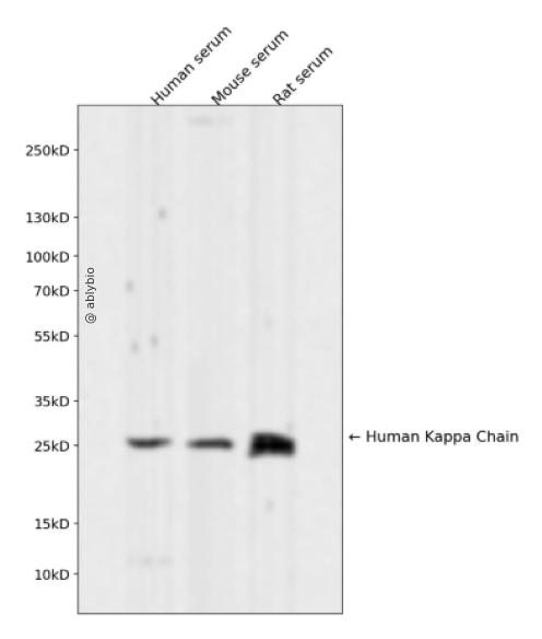 Western blot analysis of Human Kappa Chain expressed in Human serum,Mouse serum,Rat serum using Human Kappa Chain Rabbit mAb at 1:1000. Secondary antibody: HRP Goat Anti-Rabbit IgG (H+L) at 1:5000. Lysates/proteins: 30ug per lane. Blocking buffer: 5% non-fat dry milk in TBST. Detection: ECL Enhanced Kit. Exposure time: 120s.