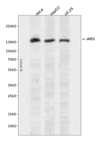 Western blot analysis of IARS expressed in HeLa,HepG2,HT-29 using IARS Rabbit pAb at 1:1000. Secondary antibody: HRP Goat Anti-Rabbit IgG (H+L) at 1:5000. Lysates/proteins: 30ug per lane. Blocking buffer: 5% non-fat dry milk in TBST. Detection: ECL Enhanced Kit. Exposure time: 120s.
