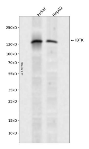 Western blot analysis of IBTK expressed in Jurkat,HepG2 using IBTK Rabbit pAb at 1:1000. Secondary antibody: HRP Goat Anti-Rabbit IgG (H+L) at 1:5000. Lysates/proteins: 30ug per lane. Blocking buffer: 5% non-fat dry milk in TBST. Detection: ECL Enhanced Kit. Exposure time: 120s.