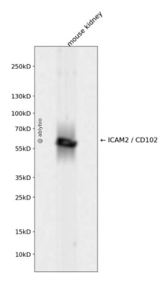 Western blot analysis of ICAM2 / CD102 expressed in mouse kidney using ICAM2 / CD102 Rabbit mAb at 1:1000. Secondary antibody: HRP Goat Anti-Rabbit IgG (H+L) at 1:5000. Lysates/proteins: 30ug per lane. Blocking buffer: 5% non-fat dry milk in TBST. Detection: ECL Enhanced Kit. Exposure time: 120s.