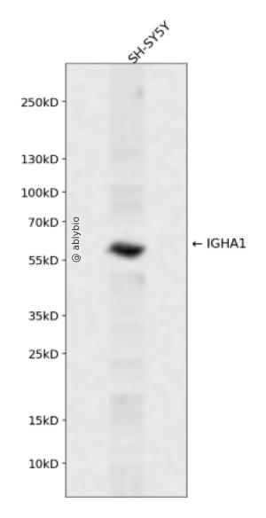 Western blot analysis of IGHA1 expressed in SH-SY5Y using IGHA1 Rabbit pAb at 1:1000. Secondary antibody: HRP Goat Anti-Rabbit IgG (H+L) at 1:5000. Lysates/proteins: 30ug per lane. Blocking buffer: 5% non-fat dry milk in TBST. Detection: ECL Enhanced Kit. Exposure time: 120s.