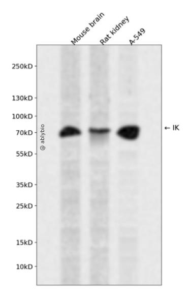 Western blot analysis of IK expressed in Mouse brain,Rat kidney,A-549 using IK Rabbit pAb at 1:1000. Secondary antibody: HRP Goat Anti-Rabbit IgG (H+L) at 1:5000. Lysates/proteins: 30ug per lane. Blocking buffer: 5% non-fat dry milk in TBST. Detection: ECL Enhanced Kit. Exposure time: 120s.