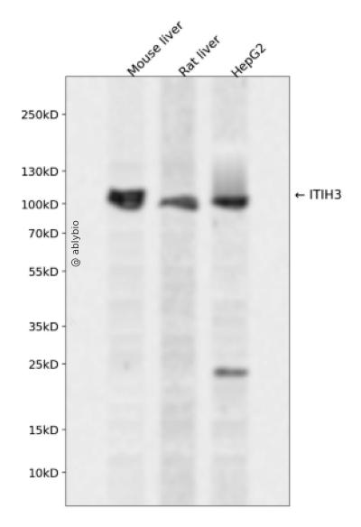 Western blot analysis of ITIH3 expressed in Mouse liver,Rat liver,HepG2 using ITIH3 Rabbit pAb at 1:1000. Secondary antibody: HRP Goat Anti-Rabbit IgG (H+L) at 1:5000. Lysates/proteins: 30ug per lane. Blocking buffer: 5% non-fat dry milk in TBST. Detection: ECL Enhanced Kit. Exposure time: 120s.
