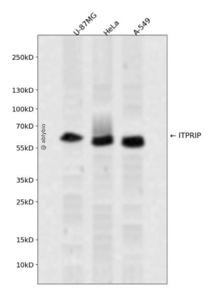 Western blot analysis of ITPRIP expressed in U-87MG,HeLa,A-549 using ITPRIP Rabbit pAb at 1:1000. Secondary antibody: HRP Goat Anti-Rabbit IgG (H+L) at 1:5000. Lysates/proteins: 30ug per lane. Blocking buffer: 5% non-fat dry milk in TBST. Detection: ECL Enhanced Kit. Exposure time: 120s.