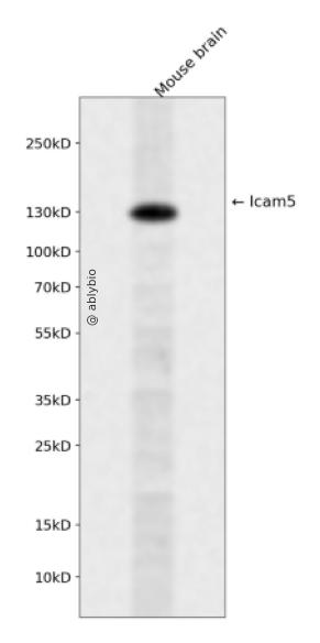 Western blot analysis of Icam5 expressed in Mouse brain using Icam5 Rabbit pAb at 1:1000. Secondary antibody: HRP Goat Anti-Rabbit IgG (H+L) at 1:5000. Lysates/proteins: 30ug per lane. Blocking buffer: 5% non-fat dry milk in TBST. Detection: ECL Enhanced Kit. Exposure time: 120s.