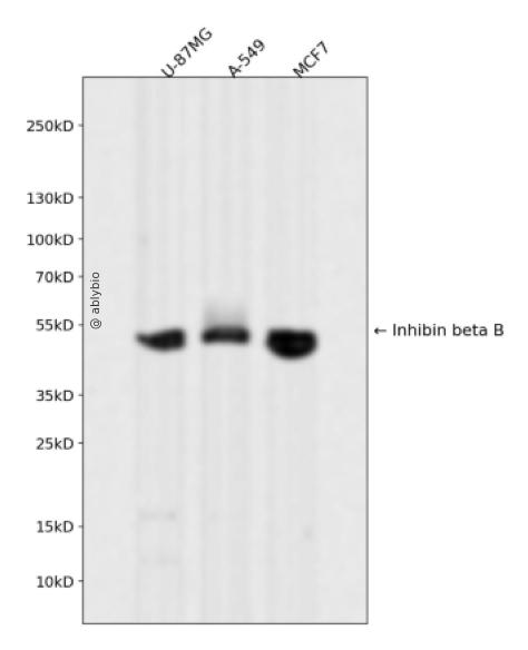 Western blot analysis of Inhibin beta B expressed in U-87MG,A-549,MCF7 using Inhibin beta B Rabbit mAb at 1:1000. Secondary antibody: HRP Goat Anti-Rabbit IgG (H+L) at 1:5000. Lysates/proteins: 30ug per lane. Blocking buffer: 5% non-fat dry milk in TBST. Detection: ECL Enhanced Kit. Exposure time: 120s.