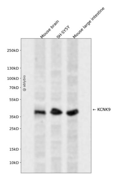 Western blot analysis of KCNK9 expressed in Mouse brain,SH-SY5Y,Mouse large intestine using KCNK9 Rabbit pAb at 1:1000. Secondary antibody: HRP Goat Anti-Rabbit IgG (H+L) at 1:5000. Lysates/proteins: 30ug per lane. Blocking buffer: 5% non-fat dry milk in TBST. Detection: ECL Enhanced Kit. Exposure time: 120s.