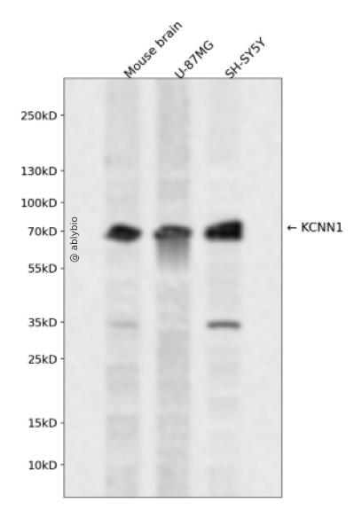 Western blot analysis of KCNN1 expressed in Mouse brain,U-87MG,SH-SY5Y using KCNN1 Rabbit pAb at 1:1000. Secondary antibody: HRP Goat Anti-Rabbit IgG (H+L) at 1:5000. Lysates/proteins: 30ug per lane. Blocking buffer: 5% non-fat dry milk in TBST. Detection: ECL Enhanced Kit. Exposure time: 120s.
