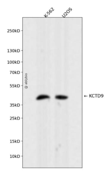 Western blot analysis of KCTD9 expressed in K-562,U2OS using KCTD9 Rabbit mAb at 1:1000. Secondary antibody: HRP Goat Anti-Rabbit IgG (H+L) at 1:5000. Lysates/proteins: 30ug per lane. Blocking buffer: 5% non-fat dry milk in TBST. Detection: ECL Enhanced Kit. Exposure time: 120s.