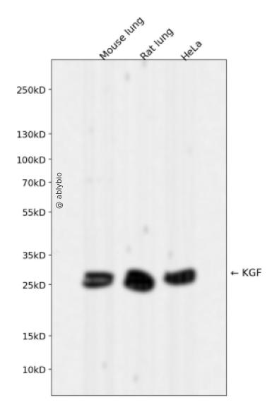 Western blot analysis of KGF expressed in Mouse lung,Rat lung,HeLa using KGF Rabbit mAb at 1:1000. Secondary antibody: HRP Goat Anti-Rabbit IgG (H+L) at 1:5000. Lysates/proteins: 30ug per lane. Blocking buffer: 5% non-fat dry milk in TBST. Detection: ECL Enhanced Kit. Exposure time: 120s.