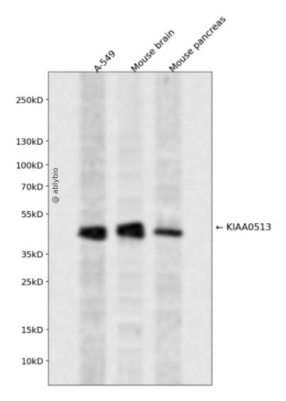 Western blot analysis of KIAA0513 expressed in A-549,Mouse brain,Mouse pancreas using KIAA0513 Rabbit pAb at 1:1000. Secondary antibody: HRP Goat Anti-Rabbit IgG (H+L) at 1:5000. Lysates/proteins: 30ug per lane. Blocking buffer: 5% non-fat dry milk in TBST. Detection: ECL Enhanced Kit. Exposure time: 120s.