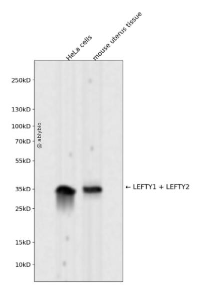 Western blot analysis of LEFTY1 + LEFTY2 expressed in HeLa cells,mouse uterus tissue using LEFTY1 + LEFTY2 Rabbit mAb at 1:1000. Secondary antibody: HRP Goat Anti-Rabbit IgG (H+L) at 1:5000. Lysates/proteins: 30ug per lane. Blocking buffer: 5% non-fat dry milk in TBST. Detection: ECL Enhanced Kit. Exposure time: 120s.