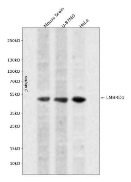 Western blot analysis of LMBRD1 expressed in Mouse brain,U-87MG,HeLa using LMBRD1 Rabbit pAb at 1:1000. Secondary antibody: HRP Goat Anti-Rabbit IgG (H+L) at 1:5000. Lysates/proteins: 30ug per lane. Blocking buffer: 5% non-fat dry milk in TBST. Detection: ECL Enhanced Kit. Exposure time: 120s.