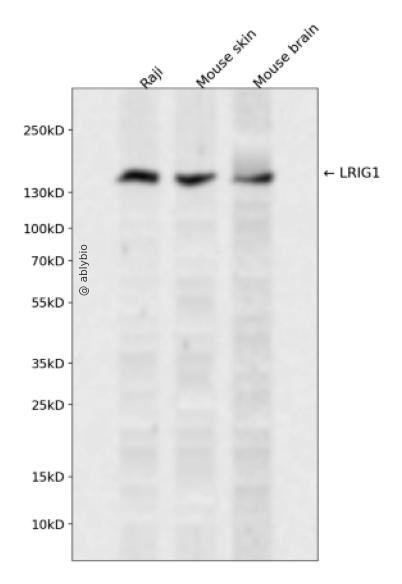 Western blot analysis of LRIG1 expressed in Raji,Mouse skin,Mouse brain using LRIG1 Rabbit pAb at 1:1000. Secondary antibody: HRP Goat Anti-Rabbit IgG (H+L) at 1:5000. Lysates/proteins: 30ug per lane. Blocking buffer: 5% non-fat dry milk in TBST. Detection: ECL Enhanced Kit. Exposure time: 120s.
