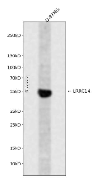 Western blot analysis of LRRC14 expressed in U-87MG using LRRC14 Rabbit pAb at 1:1000. Secondary antibody: HRP Goat Anti-Rabbit IgG (H+L) at 1:5000. Lysates/proteins: 30ug per lane. Blocking buffer: 5% non-fat dry milk in TBST. Detection: ECL Enhanced Kit. Exposure time: 120s.
