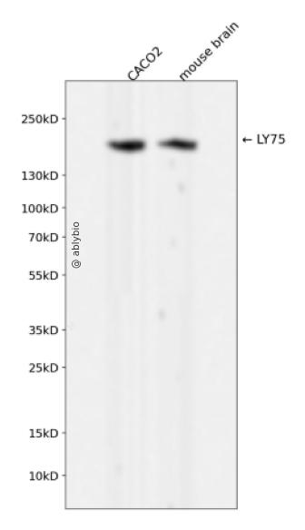 Western blot analysis of LY75 expressed in CACO2,mouse brain using LY75 Rabbit mAb at 1:1000. Secondary antibody: HRP Goat Anti-Rabbit IgG (H+L) at 1:5000. Lysates/proteins: 30ug per lane. Blocking buffer: 5% non-fat dry milk in TBST. Detection: ECL Enhanced Kit. Exposure time: 120s.