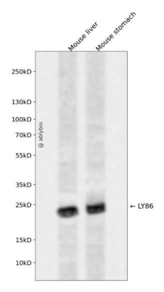 Western blot analysis of LY86 expressed in Mouse liver,Mouse stomach using LY86 Rabbit pAb at 1:1000. Secondary antibody: HRP Goat Anti-Rabbit IgG (H+L) at 1:5000. Lysates/proteins: 30ug per lane. Blocking buffer: 5% non-fat dry milk in TBST. Detection: ECL Enhanced Kit. Exposure time: 120s.